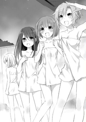 Isso provavelmente foi uma reação normal. Isso porque, Kaguya e Yuzuru que haviam se separado há pouco tempo no corredor, agora estavam ali com uma toalha de banho enrolada no torno do corpo.
