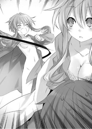Sentindo desconfiado para esses comportamentos, Shidou tirou a roupa no provador; então carregava uma toalha em uma mão e abriu a porta de correr que tinha o vidro embaçado pelo vapor.