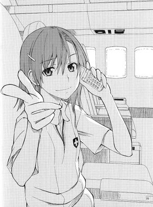 Mikoto was holding her cell phone within a passenger plane. The large plane seemed to be waiting for its turn on the runway. Currently, she could see a small charter plane taking off.