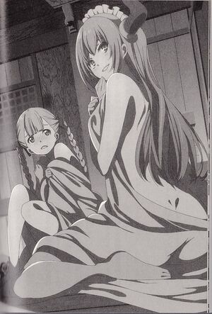 While Kyousuke sat in front of her, Biondetta bent over, pressed her raised index finger against her lips, and emphasized the twin mounds on her chest which already looked like they were going to spill from her top.