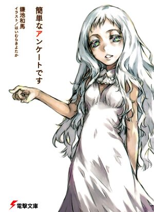 A Simple Survey (簡単なアンケートです) is a light novel written by Kamachi Kazuma (鎌池 和馬) and illustrated by Haimura Kiyotaka (はいむらきよたか) and Kasai Shin. Kamachi Kazuma is also known for the Toaru Majutsu no Index series and the Heavy Object series.
