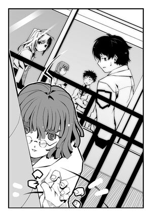 Stretching out half of her body from behind the pole, the girl lightly touched Daisuke's shoulder with her fingertip. This caused him to stiffen up with a twitch, and he violently shook off her hand.