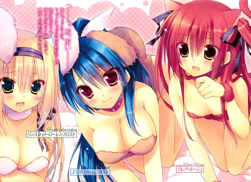 On top of the cramped bed, are 3 pretty girls in the slightly ecchi appearance of beasts.